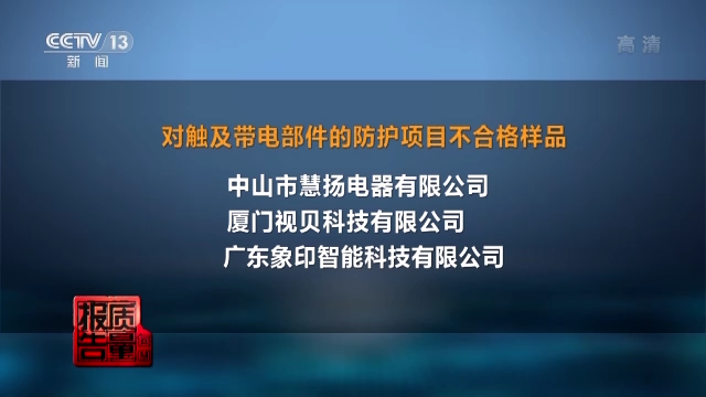 记者了解到,这次国抽中,有3批次样品在对触及带电部件的防护项目上发现问题,被判定为不合格。生产企业分别标称为:中山市慧扬电器有限公司、厦门视贝科技有限公司,以及广东象印智能科技有限公司。