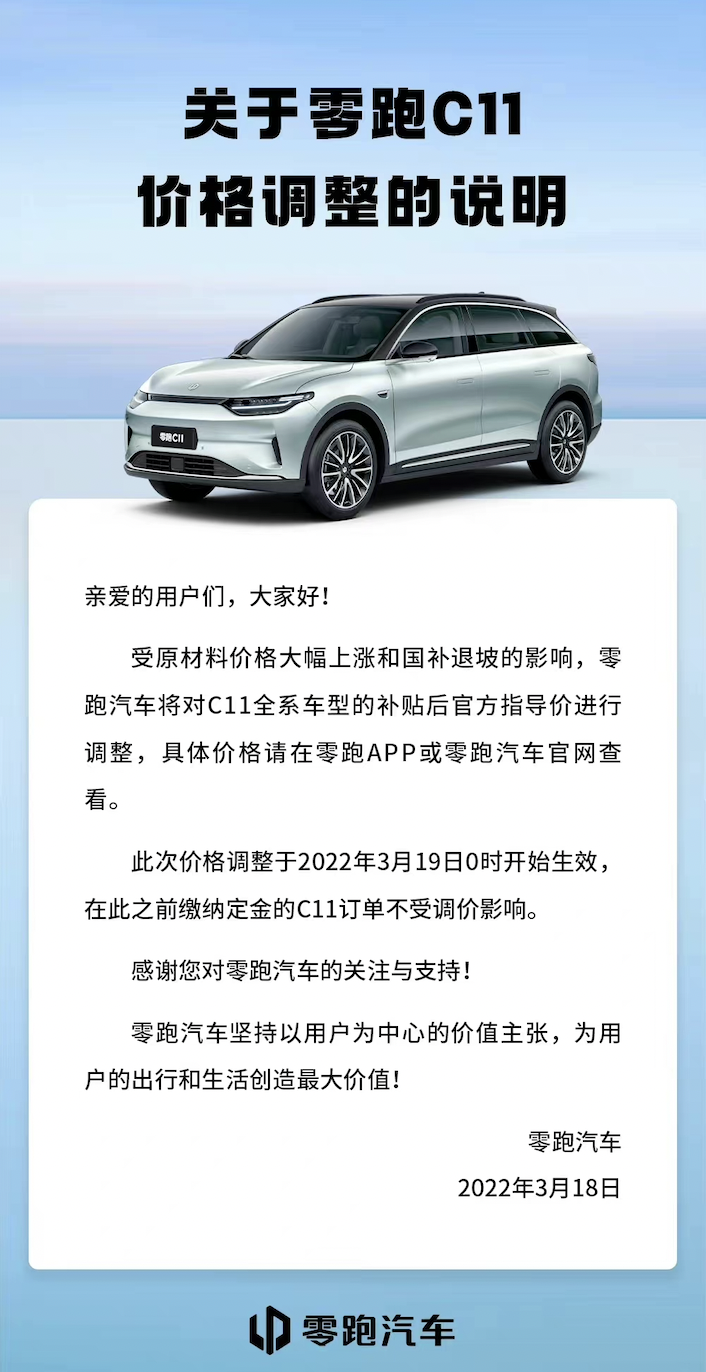 零跑汽车则表示,受原材料价格大幅上涨和国补退坡的影响,零跑汽车将对C11全系车型的补贴后官方指导价进行调整,具体价格请在零跑APP或零跑汽车官网查看。此次价格调整于2022年3月19日零时生效。官网价格信息显示,本次零跑C11涨价幅度高达2万-3万元。