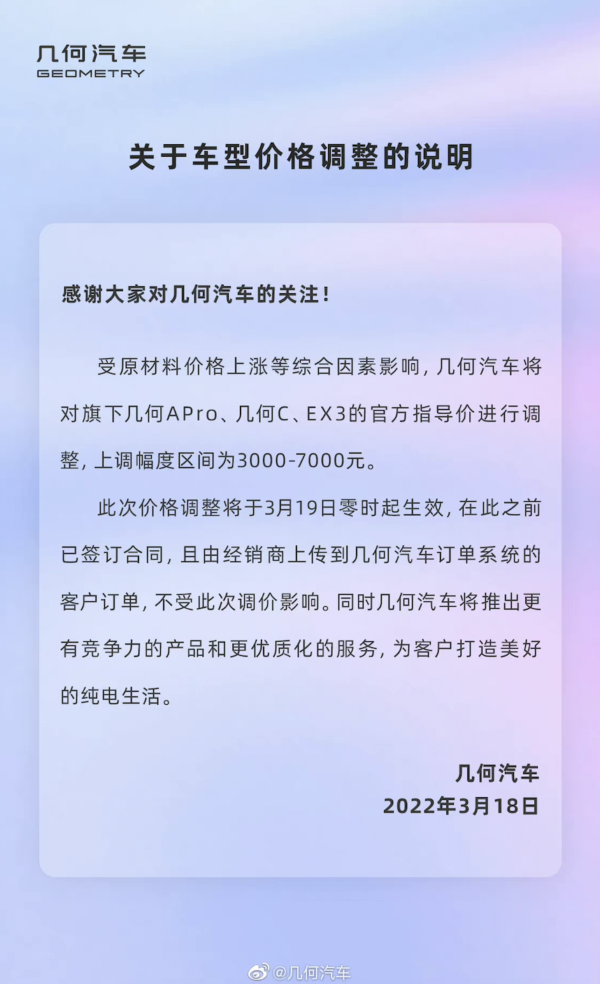 吉利旗下几何汽车在公告中表示,受原材料价格上涨等综合因素影响,几何汽车将对旗下几何APro、几何C、EX3的官方指导价进行调整,上调幅度区间为3000-7000元。此次价格调整于3月19日零时起生效。
