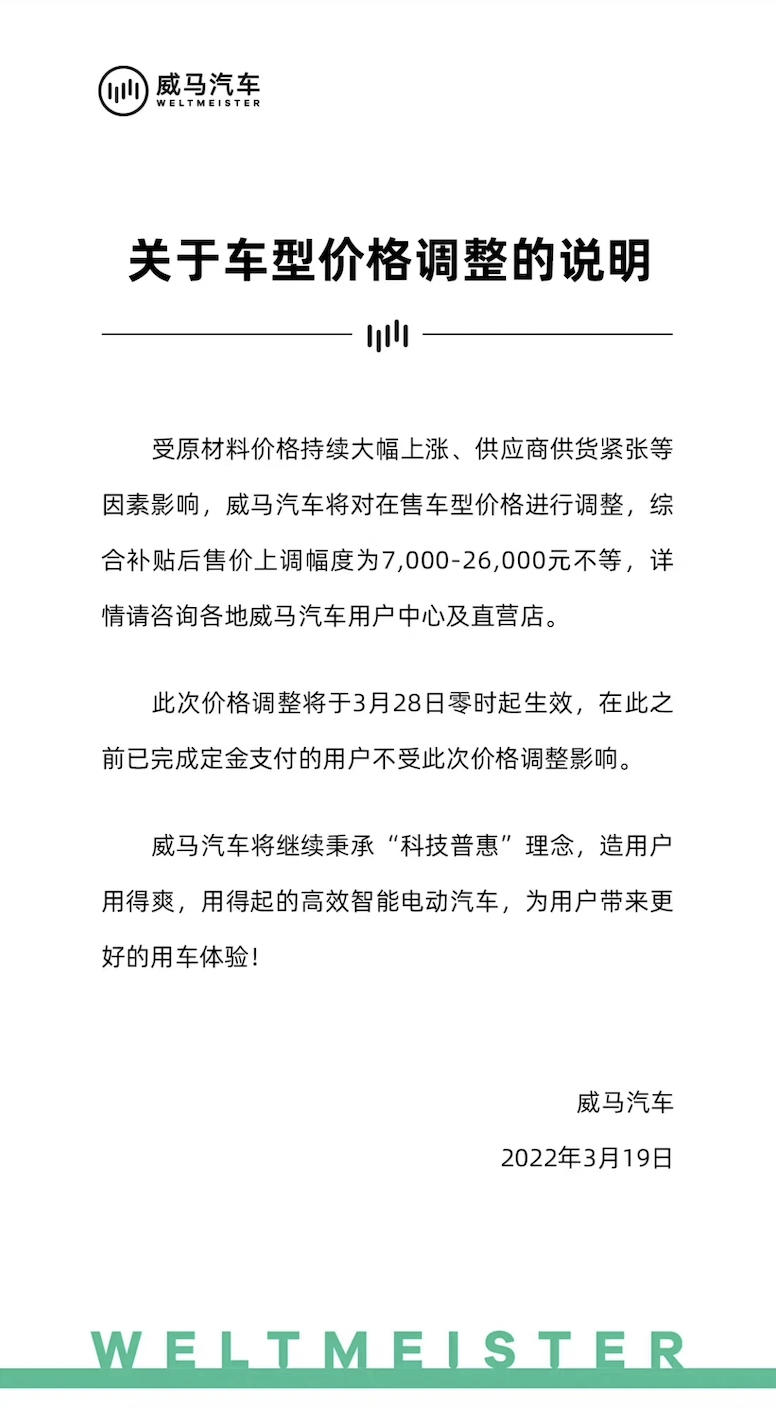 3月19日晚间,威马汽车发布公告称,受原材料价格持续大幅上涨、供应商供货紧张等因素影响,威马汽车将对在售车型价格进行调整,综合补贴后售价上调幅度为7000-26000元不等。此次价格调整将于3月28日零时起生效,在此之前已完成定金支付的用户不受此次价格调整影响。
