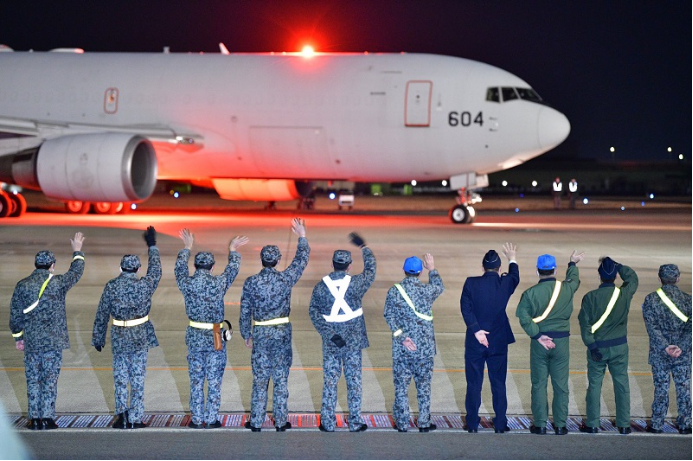 载着防弹背心、头盔等军用物资的航空自卫队KC-767加油机准备飞往乌克兰,该机不仅可以执行空中加油任务,还有一定的空间用于运输其他物资。