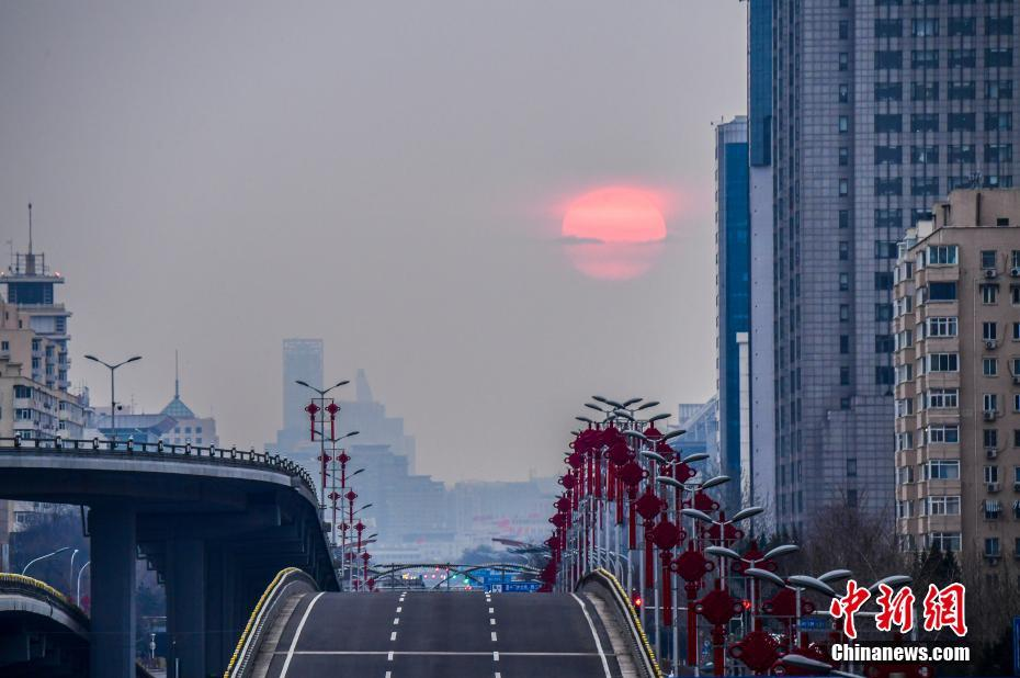 3月20日晨,北京长安街正东方向,出现城市天象景观“悬日”。当日是中国农历二十四节气之一——春分。 中新社记者 田雨昊 摄