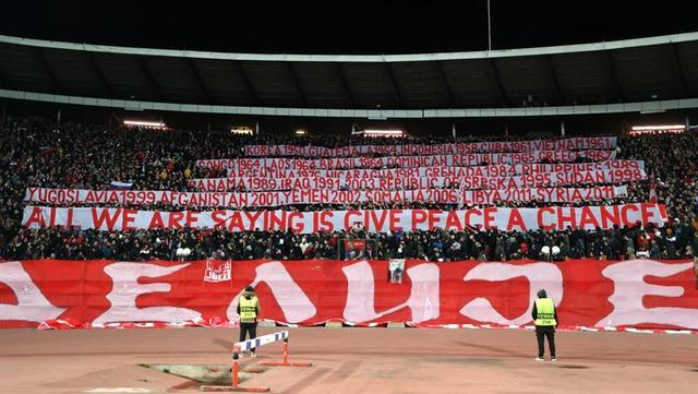 当地时间17日,塞尔维亚球迷在看台上打出六条巨大横幅,按年份细数美国、北约组织过去直接(或间接)参与入侵的20多个国家。还有一条横幅则写着“我们想说的是,给和平一个机会!”