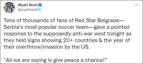 有国外媒体人在社交媒体上表示,“今晚,塞尔维亚最受欢迎的足球队贝尔格莱德红星的数万名球迷举着20多个国家的标语,对所谓的反战西方做出了尖锐的回应。”