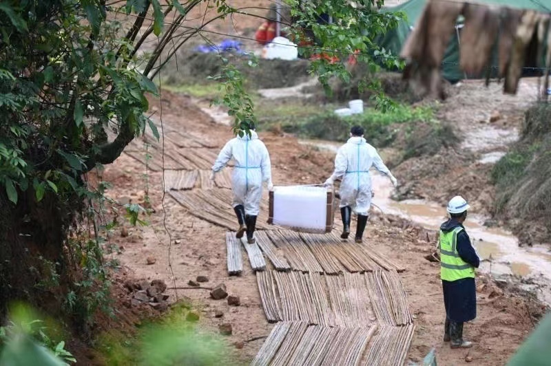 3月24日,广西梧州藤县埌南镇莫埌村东航飞机失事事故现场附近,连日降雨导致道路湿滑难行,工作人员扛着物资在临时铺设的防滑竹排上行走。