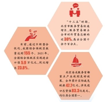 两年多来,北京“两区”建设成效突出、亮点纷呈。作为创新示范者,北京海关助力天竺综保区加快打造具有服务贸易特色的综合保税区,为北京开放发展先行先试前沿政策,为我国海关特殊监管区域创新发展探索经验。2021年度,天竺综保区进出口值、营业收入、属地税收分别同比增长37.6%、25.1%、22.1%,其中药品药械、文化艺术品进口规模分别占到全国总量的1/5、1/3。目前,园区形成了医疗健康、文化贸易、升级型消费、航空服务等重点产业。