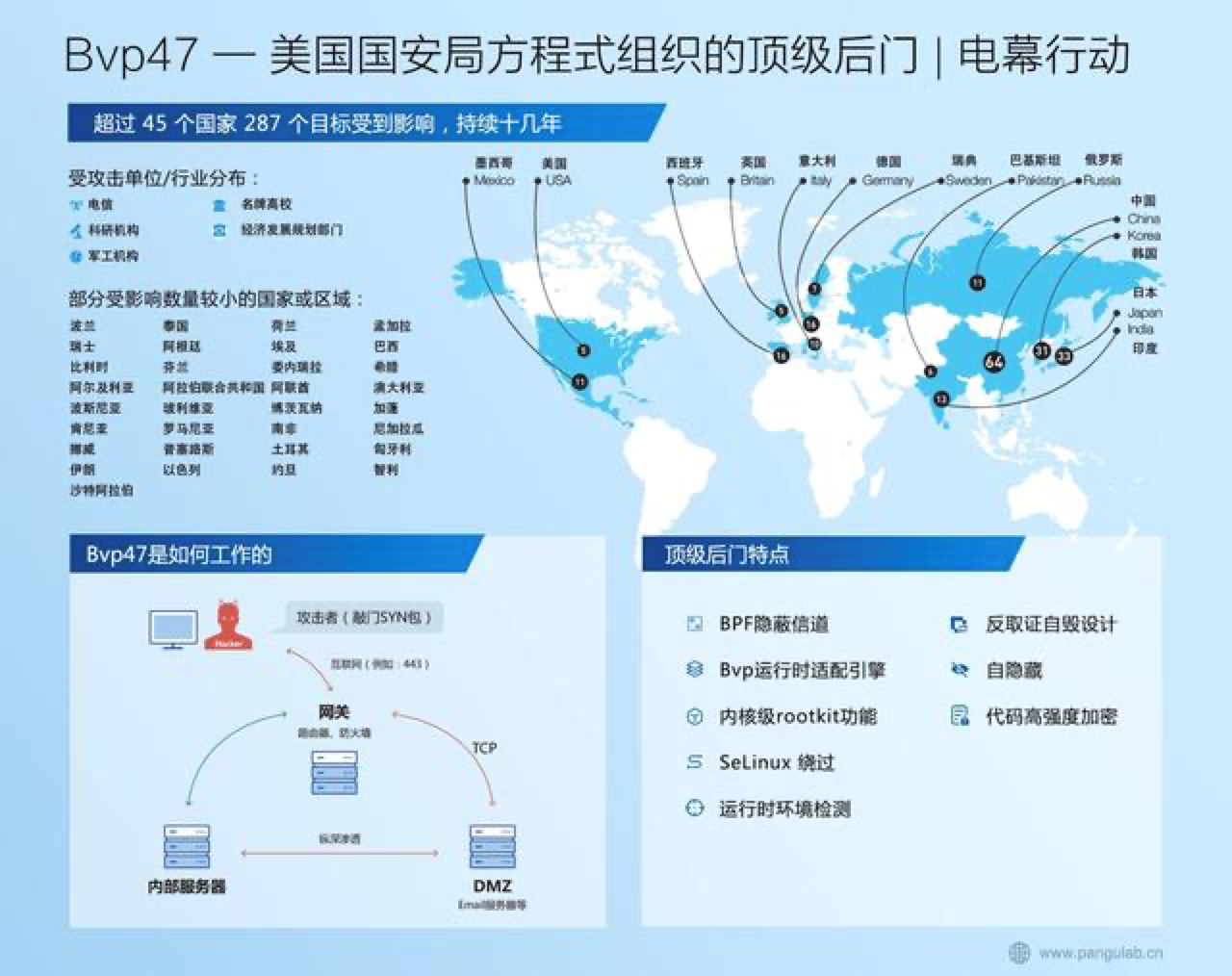 2月23日,北京奇安盘古实验室披露了隶属于美国国安局的黑客组织“方程式”利用顶级后门对包括中国、俄罗斯在内的全球45个国家开展近长达十几年的“电幕行动”网络攻击,行业涵盖电信、教育、科研、经济和军事领域。