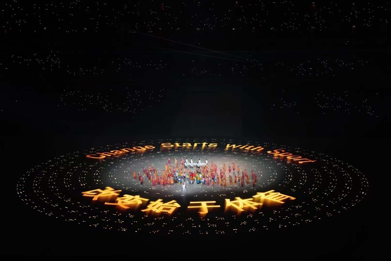 同心圆的视觉形象是贯穿始终的。开场,从圆形天窗里看见了地球,这是一个同心圆。在会徽出现的时候,所有的演员站成了同心圆。点火的时候,舞者围成了同心圆,火种点燃之后,所有演员欢呼着回到现场,最后组成了同心圆。