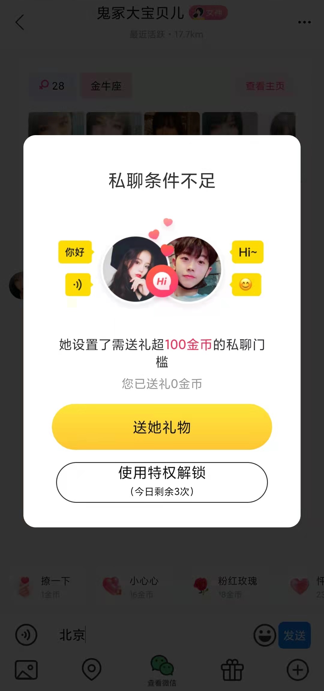 只不过,随着来搭讪的人越来越多,记者也发现了奇怪的地方。这些女性的打招呼话术都十分相似,基本就是“在哪里呀”“约会吗”这两种,看起来就像机器人留言。记者回复之后,对方也并没有再次回答。连续出现七八个“女性”搭讪后,记者刚想回复,屏幕上却出现了一行字:“私聊条件不足,她设置了需送礼物100金币的私聊门槛。”随后就要求记者进行充值,而在这个平台上,90金币就要花29块钱,也就是说,记者一句话还没聊,就得先交30多块钱的门槛费。