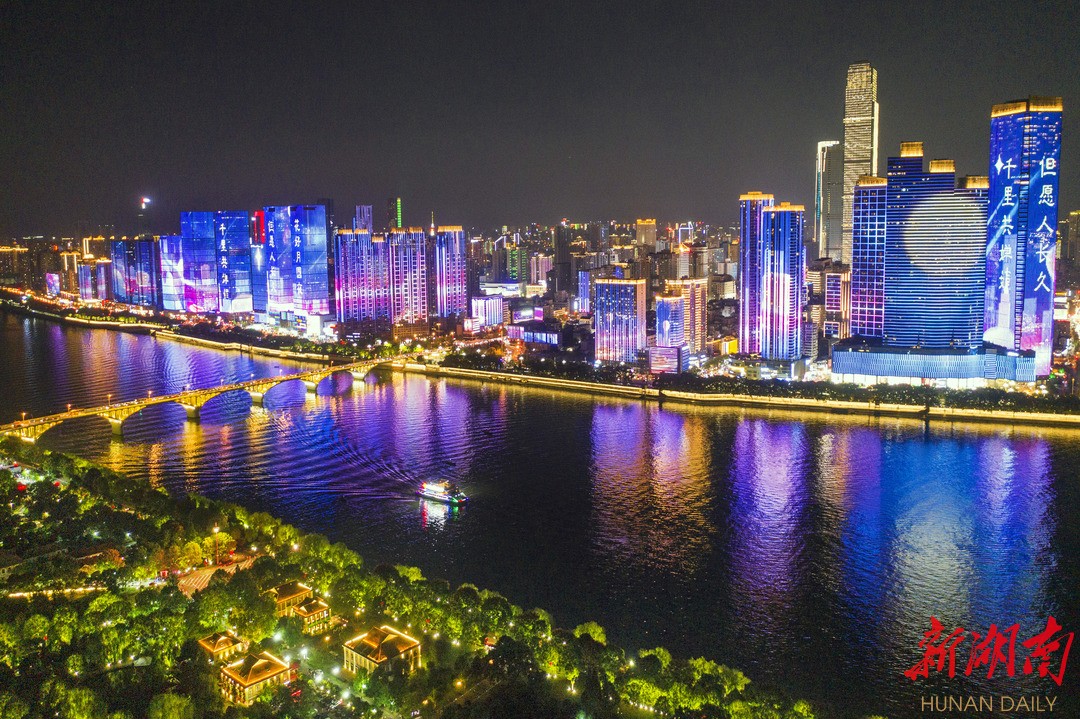 (湘江长沙段“一江两岸”上演中秋主题灯光秀。李健 摄)