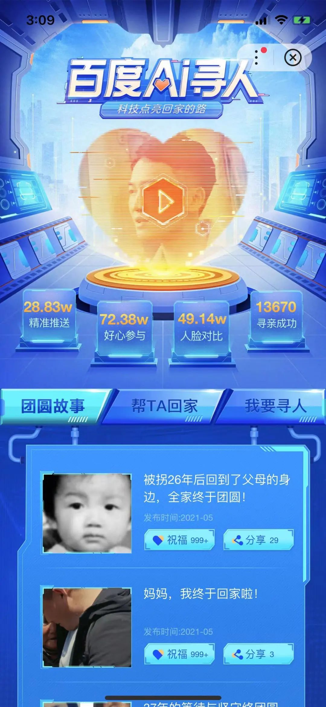 实际上,利用AI寻人也是不少互联网公司在做的。2018年11月,今日头条推出“识脸寻人”功能,用户上传走失者照片,即可与头条寻人后台的走失人员数据库直接对比出匹配结果,其中用到的技术就是通过接入实验室的面部识别技术,利用AI算法,将用户上传的走失者照片与寻人数据库的走失人群大数据进行比对,帮助走失者回归家庭;2016年,百度AI寻人平台上线,用户在平台上传一张照片,即可与全国各地救助站及宝贝回家等公益寻人平台登记的数万名走失人员进行实时比对,截至2021年10月30日,百度AI寻人平台已经帮助将近13000个家庭重新团聚,其中有不少是失散超20年甚至30年以上的。