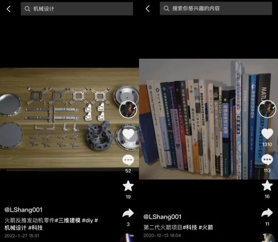目前,刘上的抖音号@ LShang001 更新了137个作品,大部分和火箭制作有关。