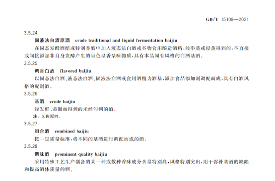 在新修订的《白酒工业术语》《饮料酒术语和分类》国家标准中,对“白酒”的定义更新为,“以粮谷为主要原料,以大曲、小曲、麸曲、酶制剂及酵母等为糖化发酵剂,经蒸煮、糖化、发酵、蒸馏、陈酿、勾调而成的蒸馏酒”。