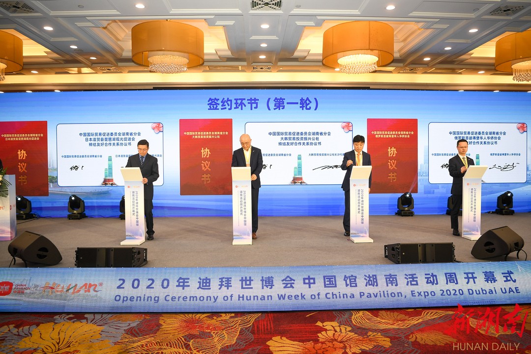 开幕式现场举行线上线下签约仪式。湖南省贸促会与大韩贸易振兴公社长沙代表处、日本滋贺县琵琶湖观光促进会湖南代表处、俄罗斯圣彼得堡华人华侨协会,以及迪拜工商会、老挝乌多姆赛省工商协会、匈牙利出口促进局武汉代表处、中国马来西亚商会大湾区代表处、阿根廷中国交流理事会、欧洲中小企业联合会签署合作协议。岳阳车库观盛供应链管理有限责任公司与Ocean Road Trading DMCC(迪拜远洋贸易)签订迪拜平行进口汽车项目,签约金额9000万美元。线上,迪拜珀普莱食品贸易有限公司与郴州市硕丰生态农业发展有限公司签订蔬菜水果采购项目;KSA承包公司、UAE商贸公司与中联 重科股份有限公司工程机械签订采购项目。