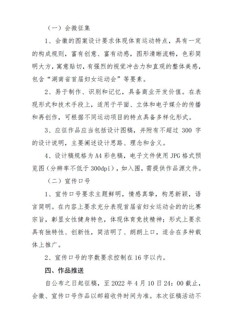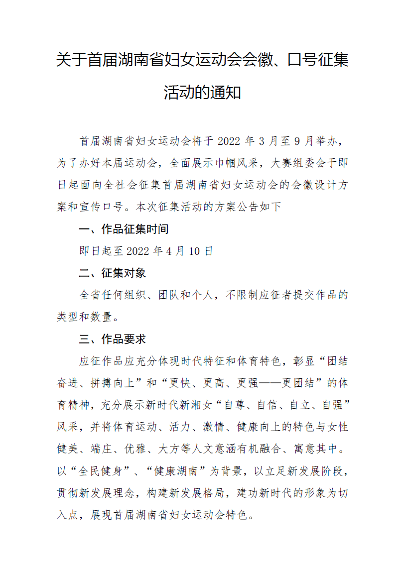 湖南日报·新湖南客户端3月30日讯(记者 蔡矜宜)运动快乐、巾帼健康!记者今天从省体育局了解到,由省妇联、省体育局等单位联合举办的首届湖南省妇女运动会(以下简称妇运会),将于2022年3月至9月举行。为更好地办出湖湘特色,展现新时代湘女风采,即日起,大赛组委会正式面向全社会征集会徽、口号,至4月10日截止。
