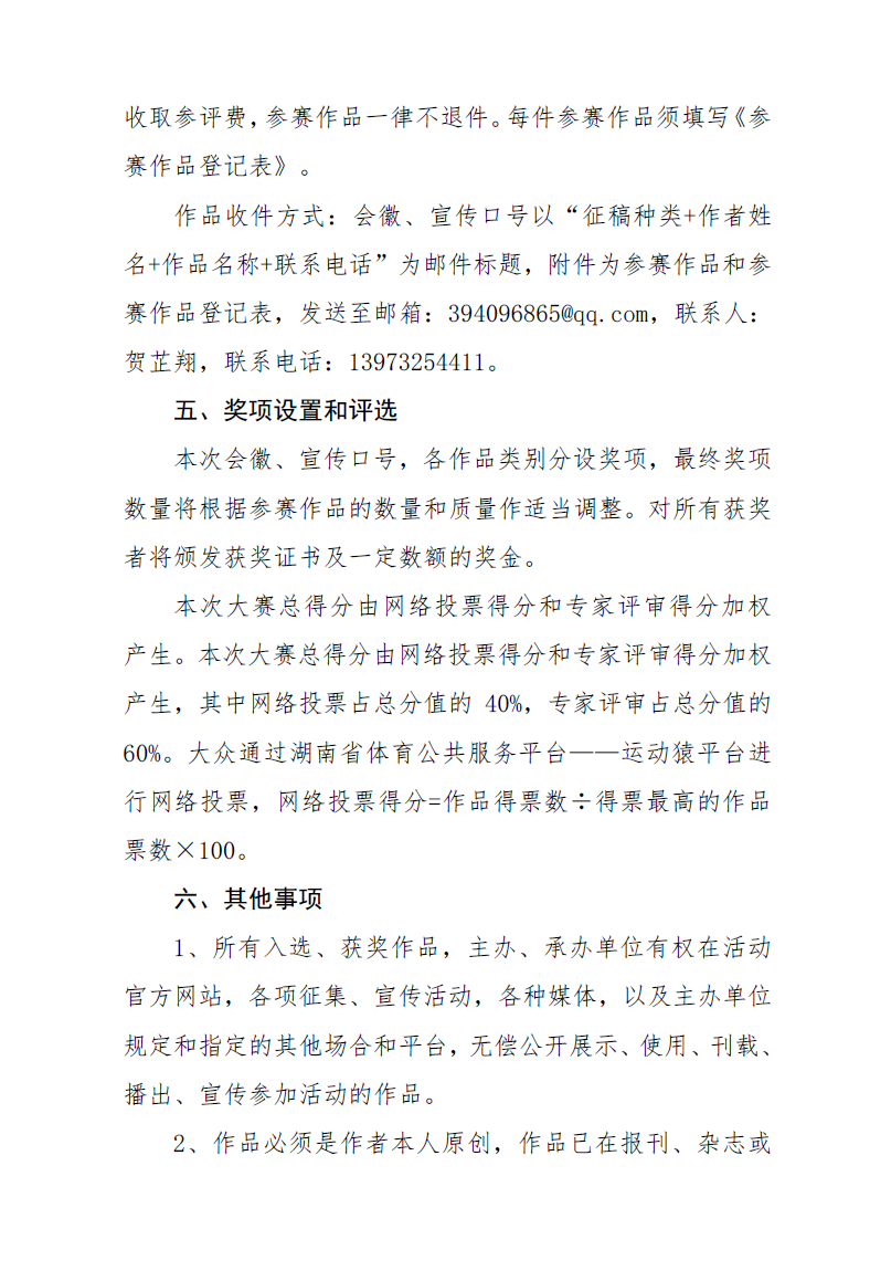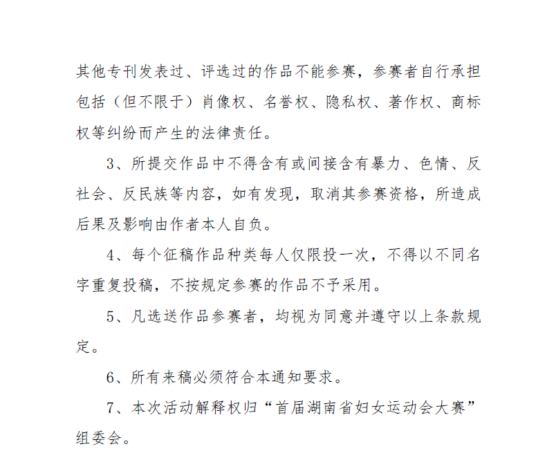 本次作品征集活动,以“全民健身”“健康湖南”为背景,要求充分体现时代特征和体育特色,彰显“团结奋进、拼搏向上”和“更快、更高、更强——更团结”的体育精神,充分展示新时代新湘女“自尊、自信、自立、自强”风采,并将体育运动、活力激情等元素与女性健美、端庄、优雅、大方等人文意涵有机融合、寓意其中。