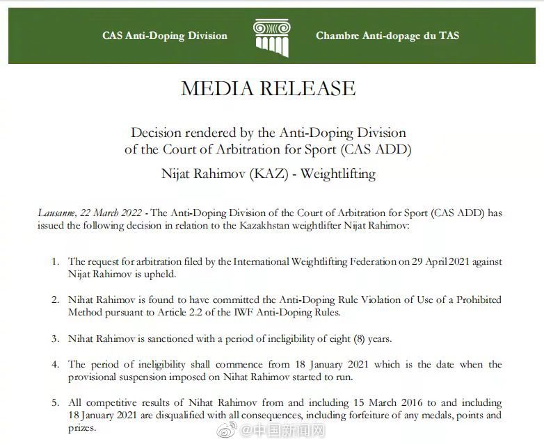 当地时间22日,国际体育仲裁法庭(CAS)通过官网发布公告称,由于哈萨克斯坦举重运动员拉希莫夫违反相关反兴奋剂规定,他在2016年3月15日至2021年1月18日期间的所有比赛成绩均不合格,并收回所有奖牌、分数和奖品,包括2016年里约奥运会举重男子77公斤的金牌。这意味着,原本获得该级别亚军的中国名将吕小军,有望递补获得冠军,从而实现连续三届奥运会获得金牌的壮举。