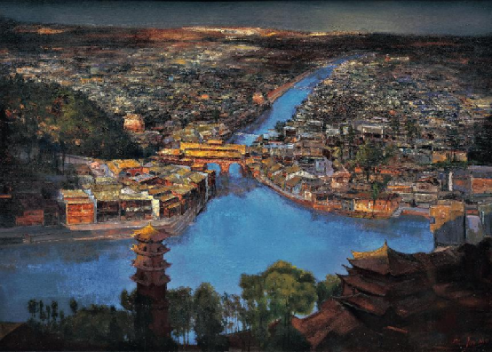 如2010年创作的《故乡夕照》,将凤凰古城的全貌逼真临摹下来,以沱江为中心,那桥那水、楼亭庭院、瓦房勾栏,清晰逼真,历历在目。可以说,如果没有对故乡刻骨铭心的真情厚爱,是难以在画面上表现这么逼真的场面、这么细腻的情感、这么生动的景象、这么靓丽的风物。一片深情尽在画中!