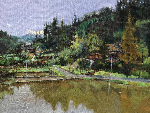 肖家墨的油画大都是写实性的风景画,但也不难体会到他在画中所寄寓的情感,以及“写意”性思考的努力。我觉得这种努力是值得肯定的,与中国传统的“意象”相结合,或许可开辟出一条新路来也未尝不可。我从他的画中看到了他的这种努力,虽然显得有些青涩与浅露了些。如2021年创作的《5G时代·湘西新貌》,作者能够敏锐捕捉到信息革命带给湘西山区人们的生活大变化,通过人群聚集的画面,可以看到未来社会将会带给边远山区人们生活的巨大变化!“春江水暧鸭先知”,现实生活中的一丝水波,可以预示社会未来的某些走向,也为艺术创作走向生活,走向民间提供了某种可能。窥一斑而知全豹,肖家墨的这种探索与努力是值得倡导的。当然,前面的路还有漫长的路程,还需付出艰辛的努力。