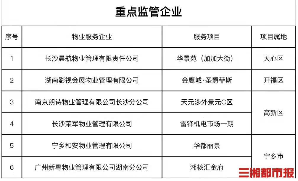 6个物业企业列入“重点监管”范围,包括长沙晨航物业管理有限责任公司、湖南影视会展物业管理有限公司、南京朗诗物业管理有限公司长沙分公司、长沙荣军物业管理有限公司、宁乡和安物业管理有限公司和广州新粤物业管理有限公司湖南分公司。