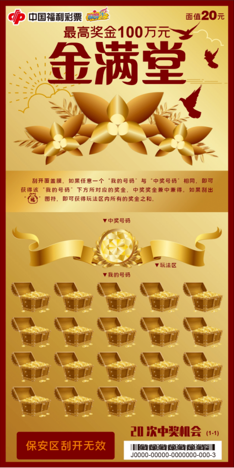 “金满堂”面值20元,10个奖级,中奖面34.49%,最高奖金100万元。该款彩票采用简单的“对数字”玩法,简单易懂,极易上手。刮开覆盖膜,如果任意一个“我的号码”与“中奖号码”相同,即可获得该“我的号码”下方所对应的奖金,中奖奖金兼中兼得。如果刮出“福”图符,即可获得玩法区内所有的奖金之和。