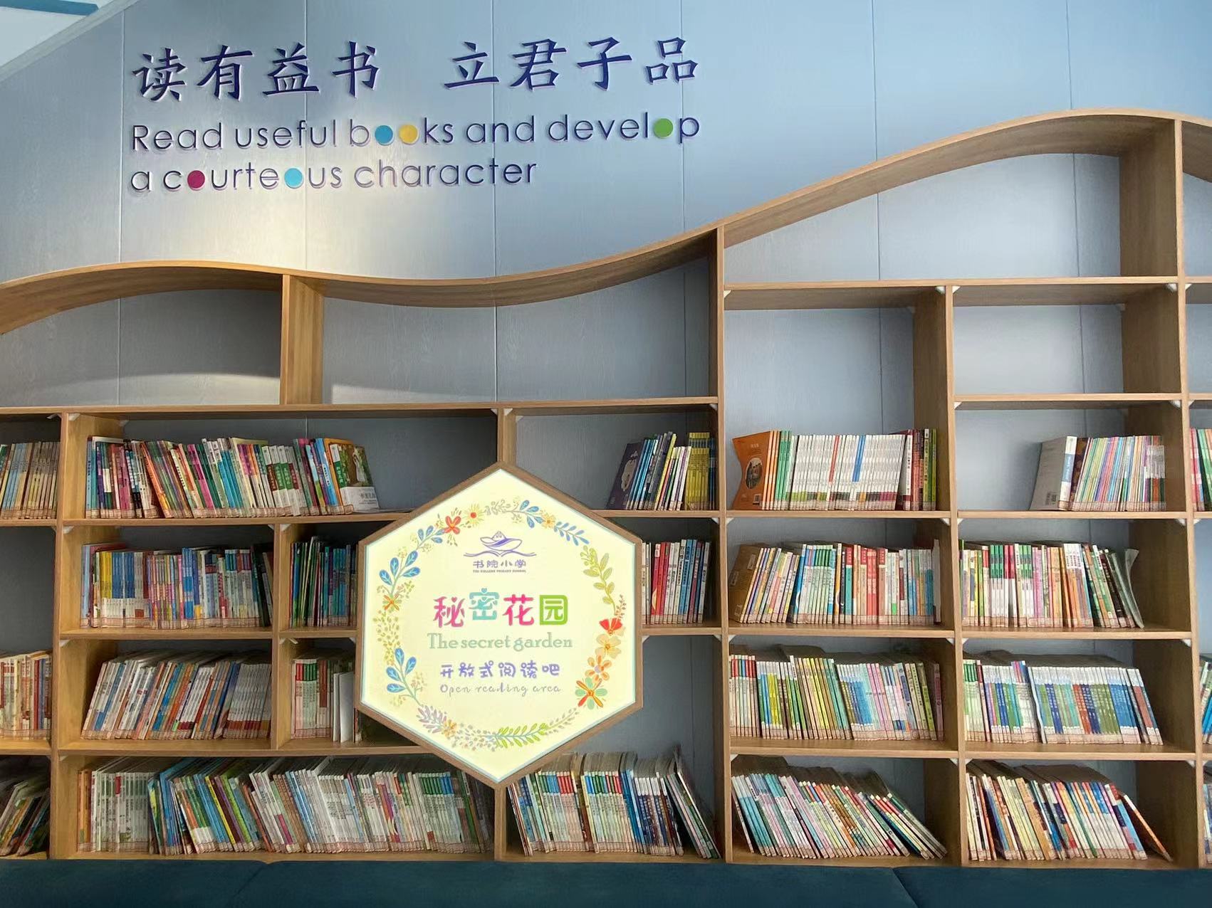 在校园有两个神秘的角落,一个在楼梯间下、一个在一年级教室旁,两个毫不起眼的角落里却藏着许多秘密与智慧。书院小学在教室外设立了两个图书角,由图书室管理老师与3-6年级的学生共同管理,“小王子”处大约放置了500本左右的书籍,“秘密花园”约放置一千六百余本。图书角的管理由师生共同参与,由3-6年级的学生进行整理收纳,查看书籍是否有缺、漏等现象,每日轮一个年级。