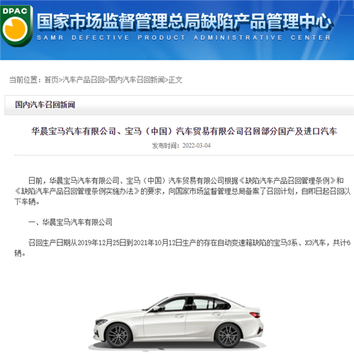 具体来看,华晨宝马宣布自即日起召回生产日期从2019年12月25日到2021年10月12日生产的存在自动变速箱缺陷的宝马3系、X3汽车,共计6辆。