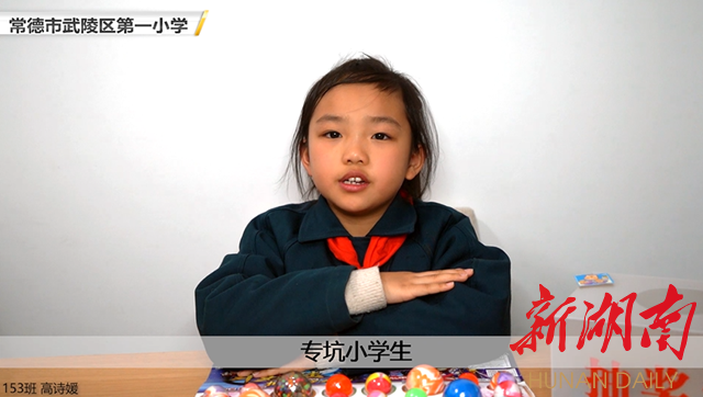 怎样才能让孩子们真正明白这种“游戏”的危害?3月29日,一条来自常德市武陵区第一小学二年级(153)班学生高诗媛一家所拍摄的警示宣传片,在当地家长们的朋友圈扩散开来。片中以真实场景引入,从学生视角讲述了“抽奖”玩具的危害,以及不法商家兜售产品的全过程,结合记者暗访画面,条理清晰,代入感强。