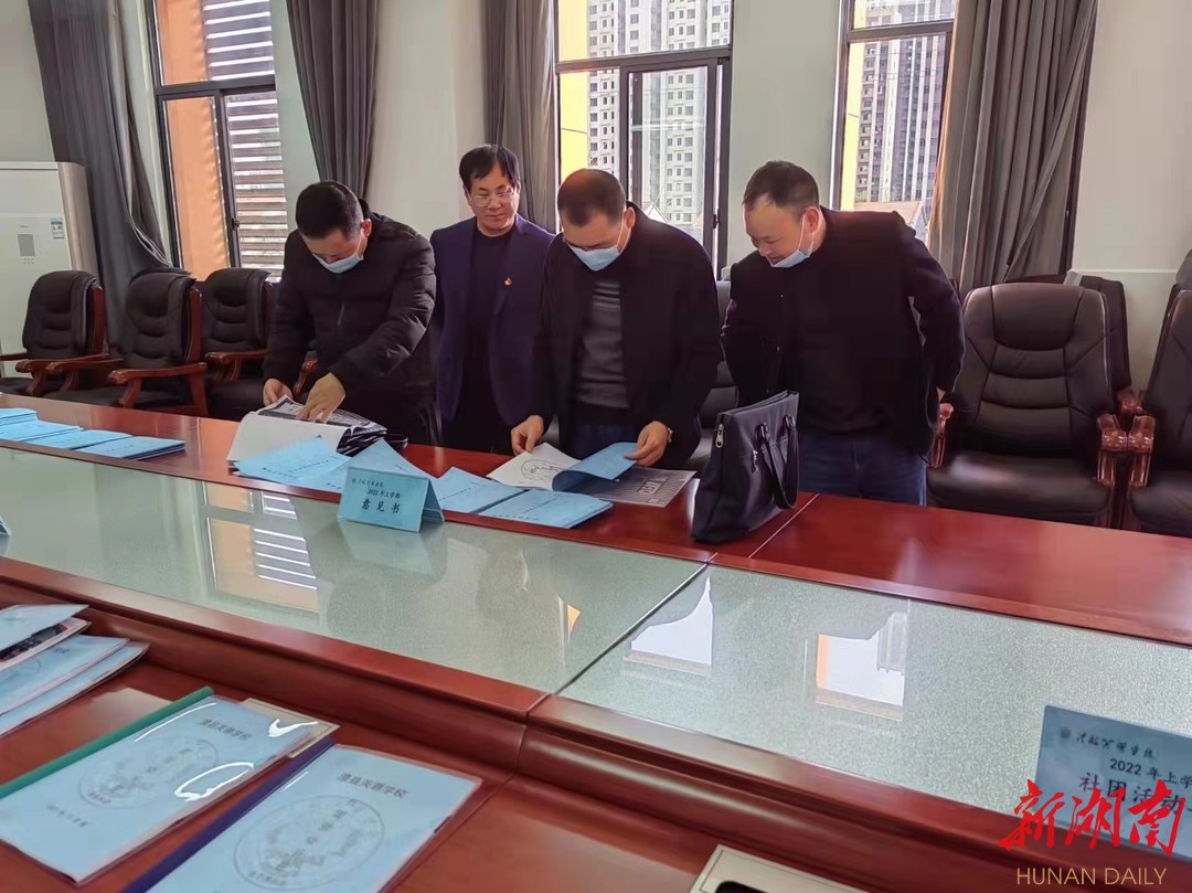 ▲澧县教育局副局长陈军与基教股股长江应军现场查看学校资料
