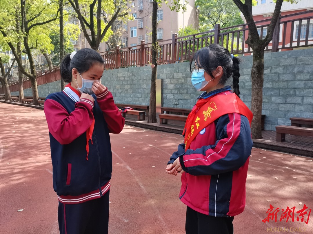 3月27日,湖南省疾控中心发布学校疫情防控要点,其中提到学校中一旦出现感染者,如果不能及时处置,学生、家长、老师之间容易交叉感染,学校就成了疫情的“放大器”。岳麓区溁湾路小学要求全体师生进入校园必须全程佩戴口罩,可是总有些同学趁着老师不注意偷偷把口罩摘下来。这群小小志愿者主动请缨,要求在下课的时间对每个班级进行检查和督促, 在看到有偷偷取佩戴口罩和同学聚集的情况,小志愿者们就会上前主动提醒,盯着他们戴好口罩才离开。“勤洗手,戴口罩,常锻炼”,小小志愿者们的温馨举动,温暖着溁小,为疫情防控奉献着自己的力量。