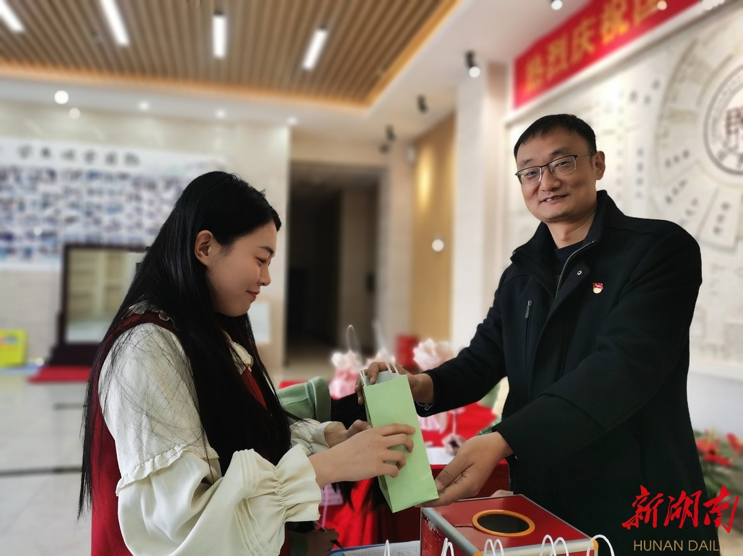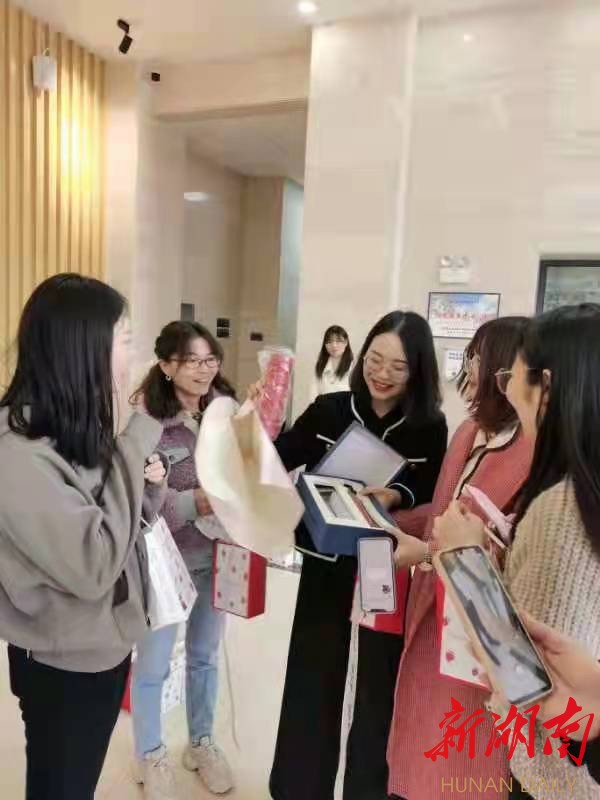 新湖南客户端3月8日讯(通讯员 杨文武)3月8日早上,长郡外国语实验中学抱朴楼大厅里洋溢着幸福的笑声,原来是郡外女教师们在抽盲盒。厅门口,用红布装饰的桌子上摆满了各种精心包裹的礼物,每一位走进学校的女老师们签到后都可以抽取一份小礼物,包括香水,口红、护手霜、巧克力等。