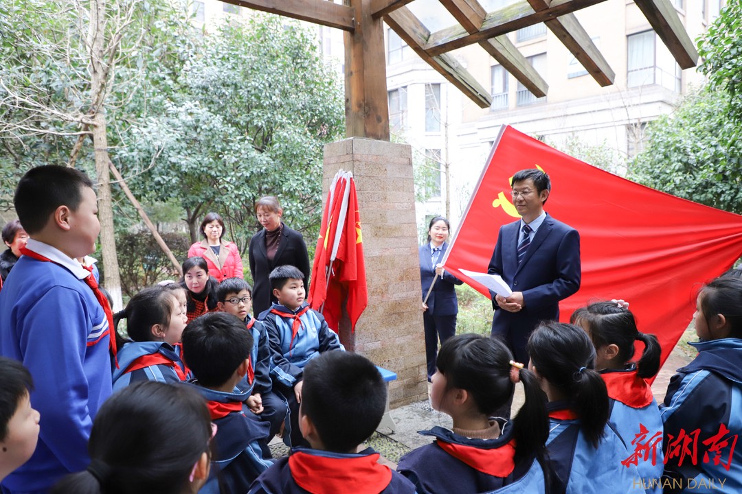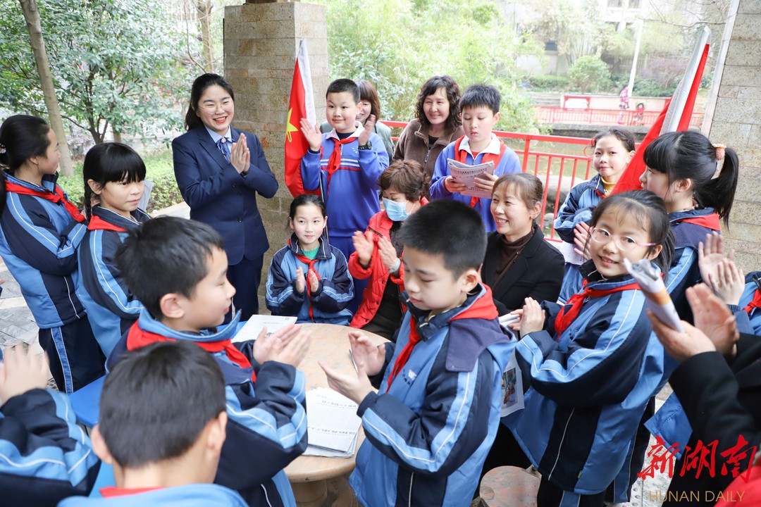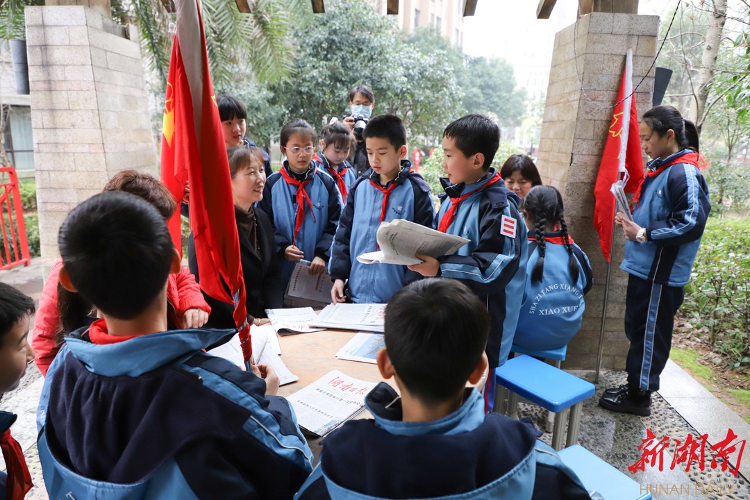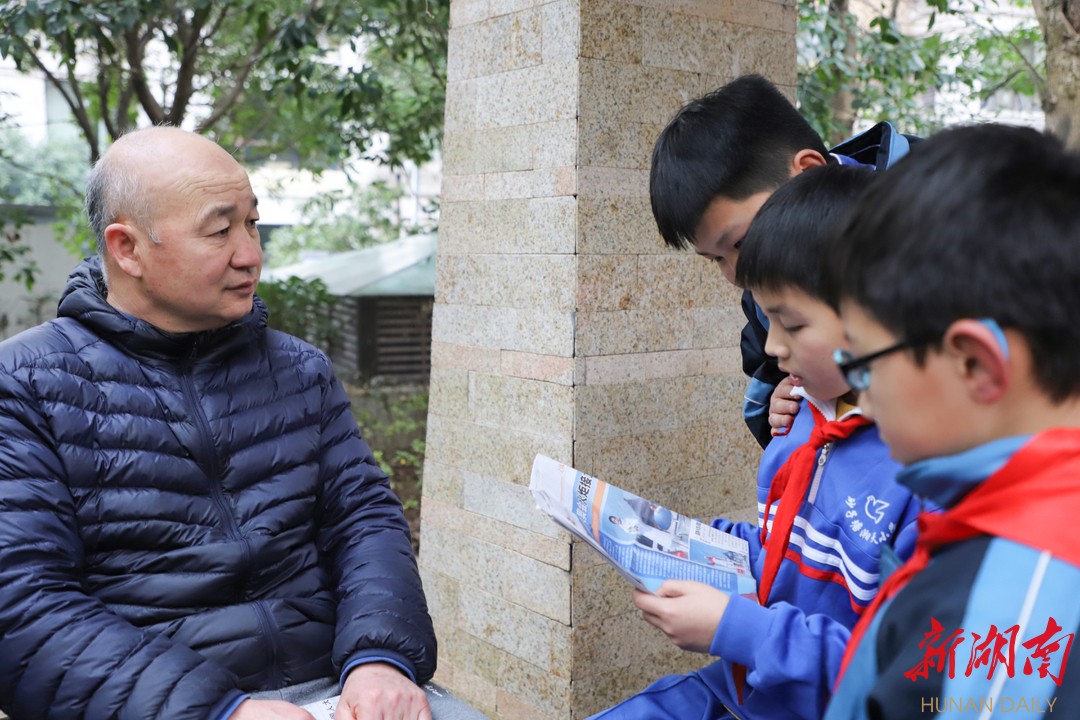 下午两点半,天空下起了绵绵春雨。在长沙奥林匹克贡院小区的凉亭里,砂子塘湘天小学四五年级的23名少先队员手握《湖南日报》,为来自该小区的爷爷奶奶读党报。活动前,学校党支部副书记高志勇在这方小小凉亭内,给孩子们讲述起了雷锋的故事,他通过雷锋故事中的细节向同学们传达了雷锋精神的丰富内涵,除了助人为乐之外,还蕴含有爱岗敬业、无私奉献等。讲话最后,高志勇向同学们发起倡议:“雷锋精神常学常新,希望同学们怀着一颗真诚的心,从自身做起,于日常坚持。同学们,你们愿意吗?”“愿意!”孩子们是这么答的也是这么做的。