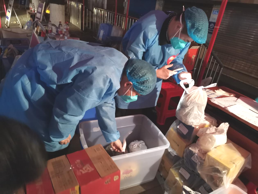 负责牵头组织此次志愿服务的队员梁钰莹,在现场既是“指挥员”,又是“作战员”。这里有很多老人家平日里很少出门,也不会使用智能手机,梁钰莹一一帮助扫码登记,并为他们发放一次性咽拭子样本采样器,对待老人和孩子,她总是多一分安抚。临时中午,另一组志愿者精心准备即将要送出的爱心盒饭,爱心盒饭包含了3荤1素,总共60多份,打包后第一时间送至井旺社区服务中心。