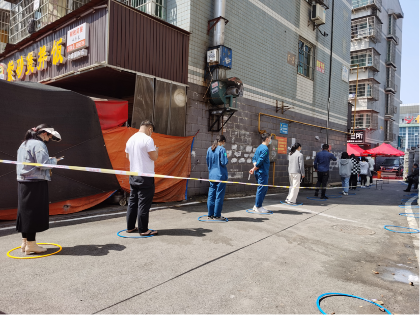 3月29日早上8点,刘汝佳准时到达了高桥街道永祥社区。到达现场后,满地整齐排列的“金刚圈”让刘汝佳眼前一亮。在宽度有限的空地上,拉起了醒目的警戒线,警戒线内整整齐齐摆放着两列塑料圈,圈与圈之间前后左右间隔都在1.5米以上,信息登记等候区的为黄色圈,检测等候区的为蓝色圈。核酸检测现场,居民们一个个规规矩矩地站在“金刚圈”内,一个大哥笑呵呵地说:“社区这个措施好,比‘一米线’还有仪式感,给我们划定一个‘金刚圈’,‘出圈’就会显得特别扎眼,让人都不好意思了。”