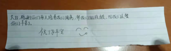 “看到隔离孩子手写的字条,我所做的一切都值得!”喻达在电话那头谈起这张字条带给他的感动。