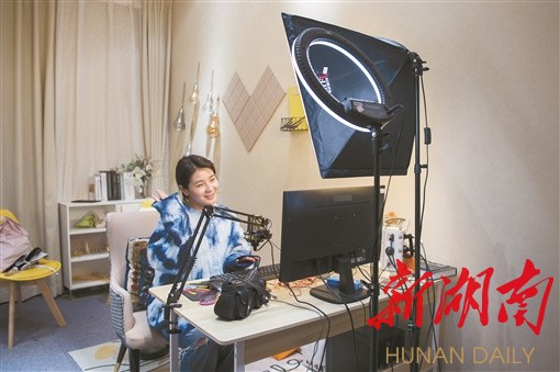 (2021年9月13日,马栏山视频文创产业园二咖传媒的直播间里,主播覃芯在直播。湖南日报全媒体记者 辜鹏博 摄)