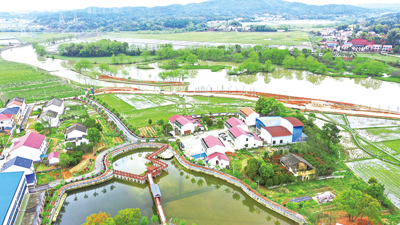 沿着沿河观光廊道往前走,左边是一条河流,河中有两大块湿地,绿树成林、鸟雀翻飞;右边是平整的大片稻田,蛙声一片。漫步新型居民示范区,房屋错落有致,柏油路干净整洁,紫荆花开,室内篮球馆、健身器材等基础设施一应俱全,一派充满诗意、生机盎然的田园风光。