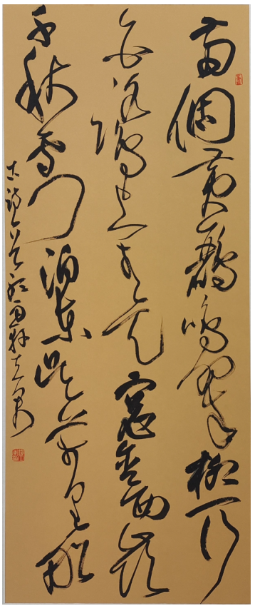 写字要书化,作画要画化。不生化则无趣,生化才能超乎形象之外。观赏谭立军写草书有一种在仙境中翱翔,超脱了尘世的感觉。他的草书把握了行距疏空处理的“度”,笔质和墨线品质如筋骨,雄强劲健,行间空间节律变化颇为丰富。有时受高涨情感的驱使,某些舒展的线条不经意地侵入邻行的字间空间,使畅快的行间空间流动受阻,并且,蜿蜒渗入行中的字间空间,行间空间的节奏便变得委婉、细腻和富于情趣性,使所表现的主体得到最突出、最集中、最明豁的视觉效果,形成了自己独特的审美体系和草书路向。