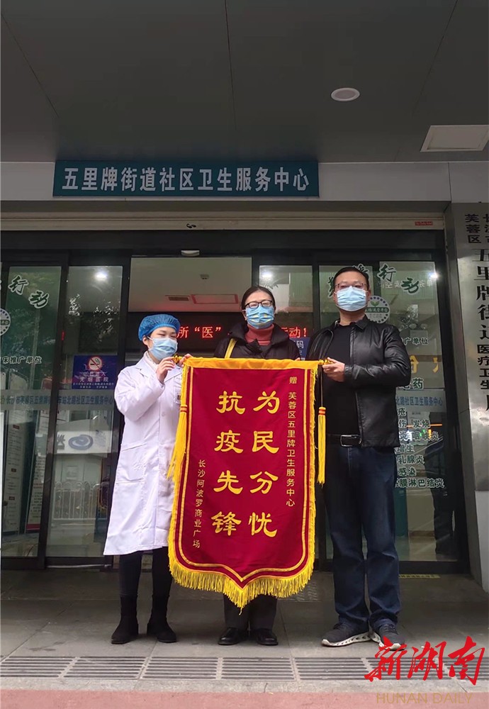 3月1日上午,阿波罗商业广场副总徐晖以及长株潭汽车站站长来到五里牌街道社区卫生服务中心,为坚守在一线的医护人员、志愿者赠送锦旗,以表达他们对所有一线工作人员的感恩之情。徐晖感慨万千地说道:“真心感谢医护人员和所有的工作人员,大家任劳任怨,风雨无阻,为我们企业单位开展核酸检测采样,你们真的吃得苦、耐得烦!”五里牌街道社区卫生服务中心主任仇凤华表示:“穿上这身防护服,为防疫工作贡献一份力量,我们也很自豪!”