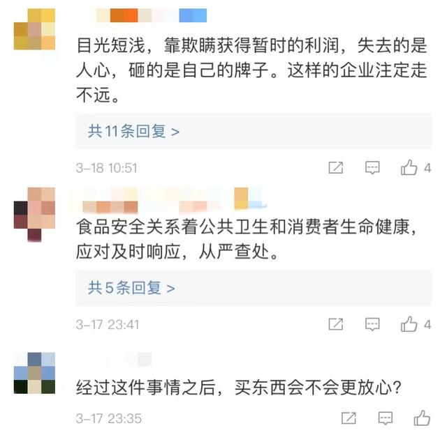 “靠欺瞒获得暂时的利润,失去的是人心,砸的是自己的牌子,这样的企业注定走不远。”“食品安全关系着公共卫生和消费者生命健康,应及时响应,从严查处!”“经过这件事后,买东西会不会更放心?”此事一经曝出,消费者们纷纷表示应严惩不贷。