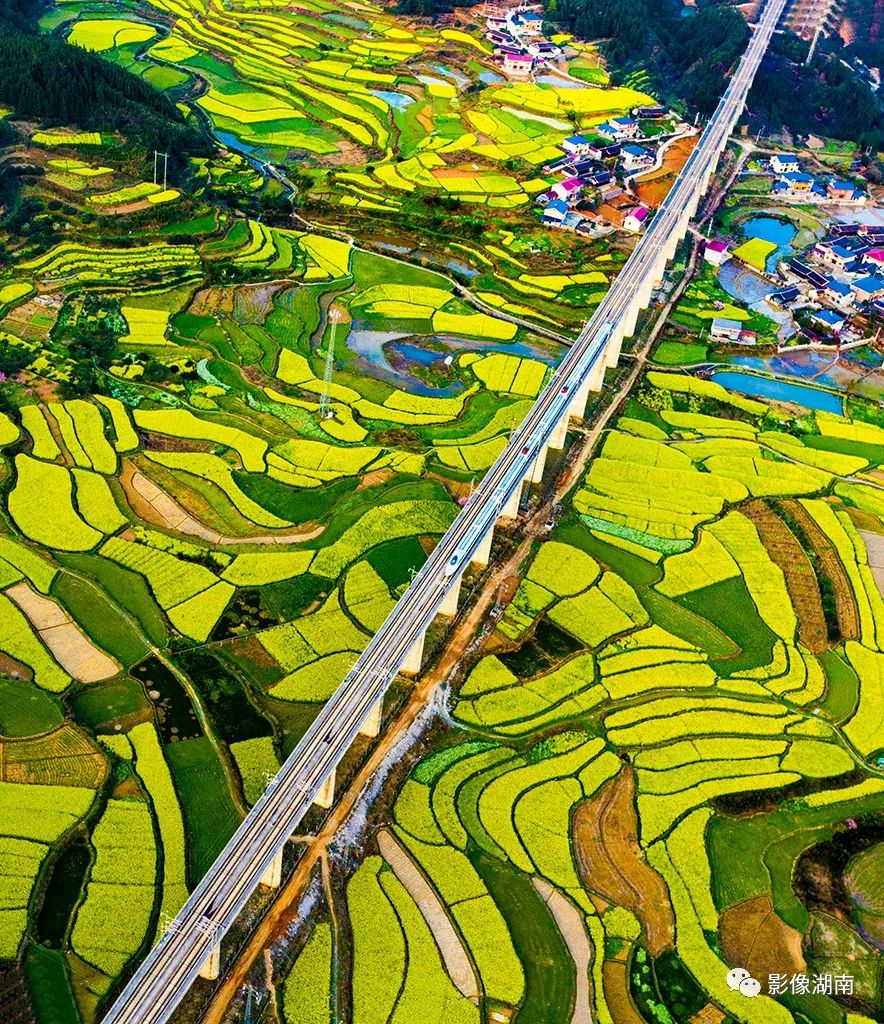 ▲怀化中方县,沪昆高铁穿过油菜花海。