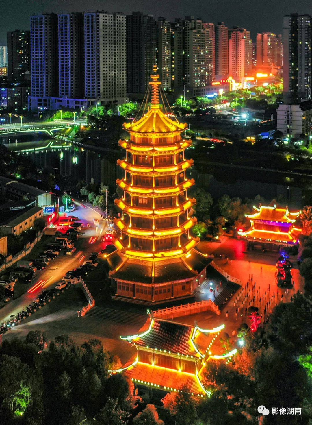 ▲怀化市鹤城区鹤鸣州一带流光溢彩,一派节日氛围。