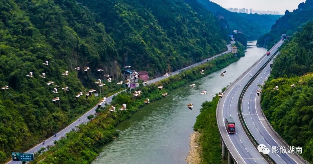 ▲G60高速和G320国道邵阳洞口县地点,高速公路和国道犹如一条飘带蜿蜒在青山绿水之间,百鸟飞翔而过,汽车川流不息,美丽而壮观。