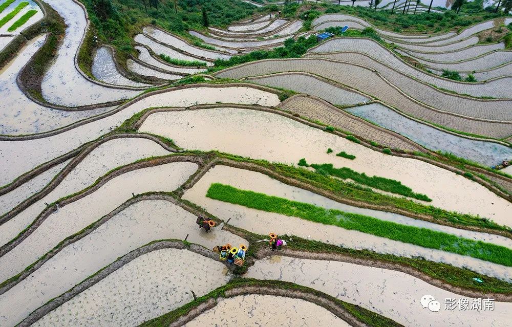 ▲溆浦县葛竹坪镇山背村,正在举办花瑶梯田插秧节,层层梯田蓄水充盈,田埂蜿蜒。