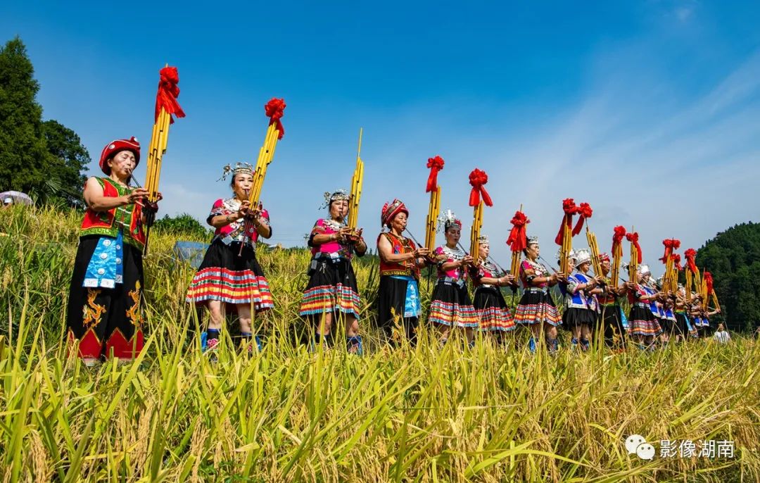 ▲芷江侗族自治县牛牯坪乡千丘田村,当地政府在稻田边举行芷江“玉腰米”优质稻种植基地开镰仪式,身着侗族服饰的村民吹起芦笙,喜庆丰收年。