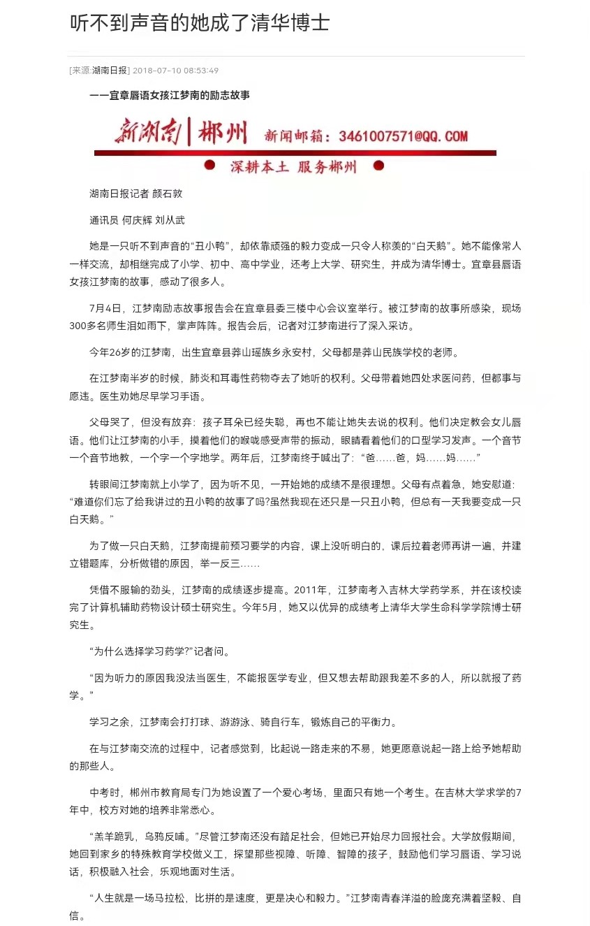 当天,我迅速写下《江梦南:用眼睛聆听世界的女孩》一文,在新湖南刊发后点击量一路飙升。随后,《听不到声音的她成了清华博士——宜章唇语女孩江梦南的励志故事》在湖南日报刊发。