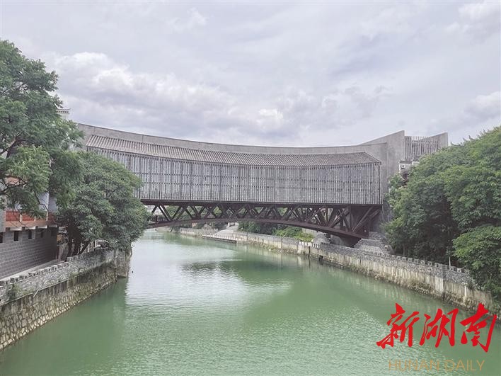 画桥的进出口,设计在古城街道中,周边是居民屋、小客栈、小餐馆。它的外墙,采用湘西地方的水刷石,下面部分,像湘西本土建筑一样用石块垒砌。整个建筑,青砖黛瓦,绘出人间烟火色,完美融合于周边的生活节奏。