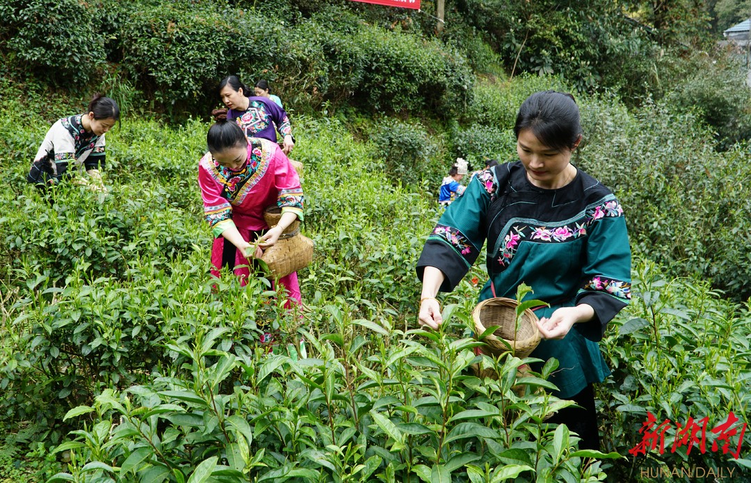 3月18日上午,湘西土家族苗族自治州保靖县吕洞山镇黄金村黄金寨,艳阳高照,满山满岭的茶芽都趁着阳光舒展腰身,尽情吮吸着天地精华。