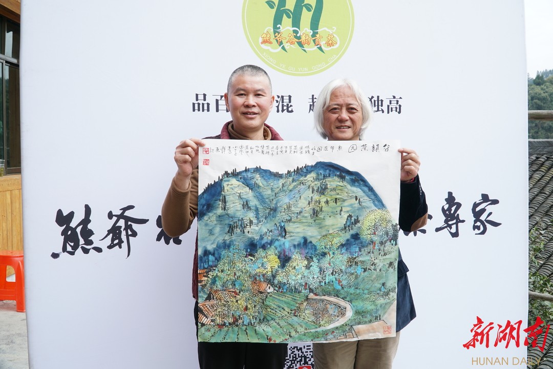 一旁更是热闹,毛光辉、黄蔓之、彭元武、彭奎华、夏令兵等著名书画家,纷纷提笔创作。毛光辉创作的《谷韵茶园》,黄蔓之书写的《种茶世家 制茶传人》,彭元武绘画的《春和景明》等作品,令人赞不绝口。