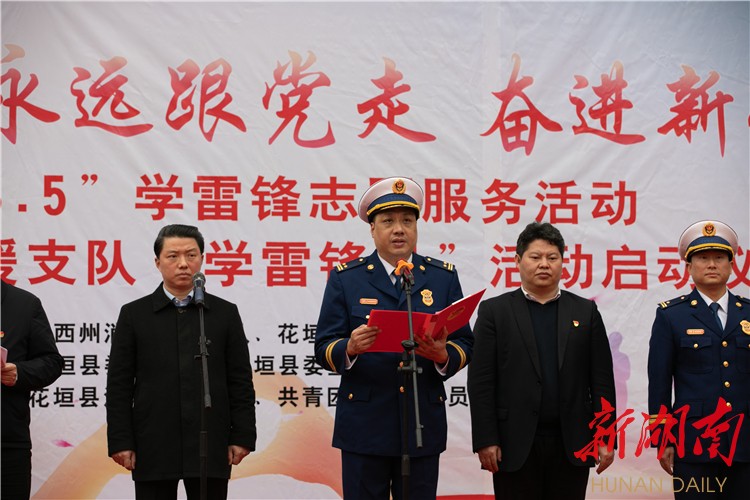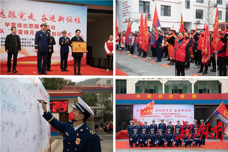 新湖南客户端3月5日讯(通讯员 邓凯 王海芳 李耀堃)3月5日,湘西土家族苗族自治州消防救援支队“喜迎二十大、永远跟党走、奋进新征程”学雷锋志愿服务活动启动仪式,在花垣县举行。湘西州委副书记、花垣县委书记廖良辉,州消防救援支队党委书记、政治委员银卫华,以及有关领导出席活动,花垣县各单位志愿服务队员300余人参加活动。